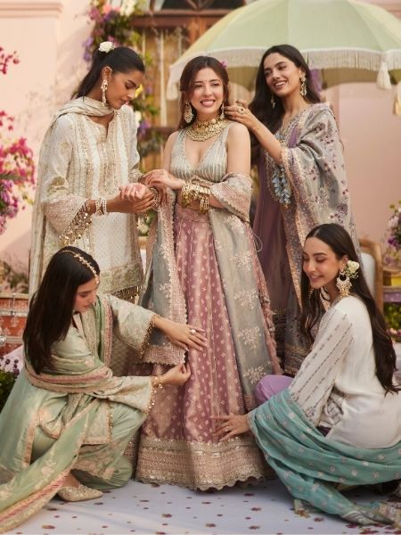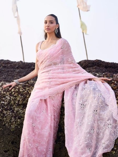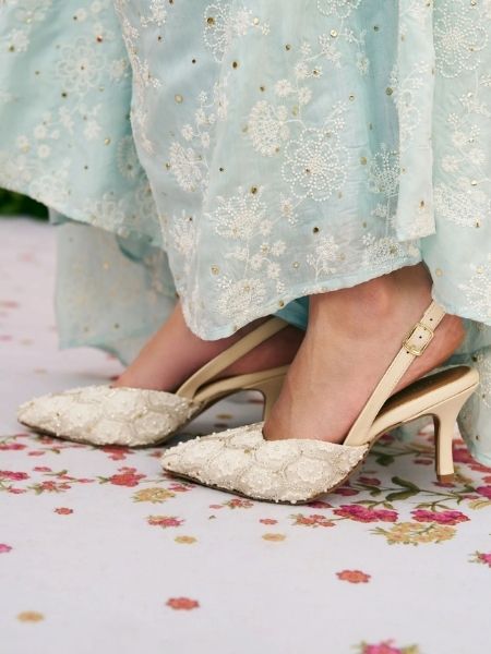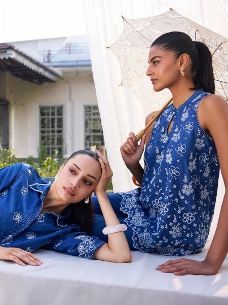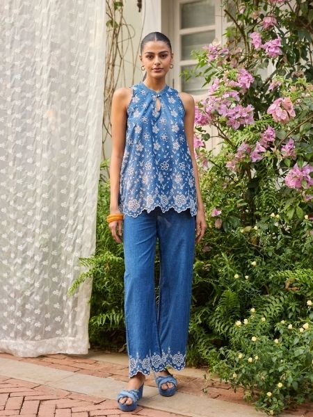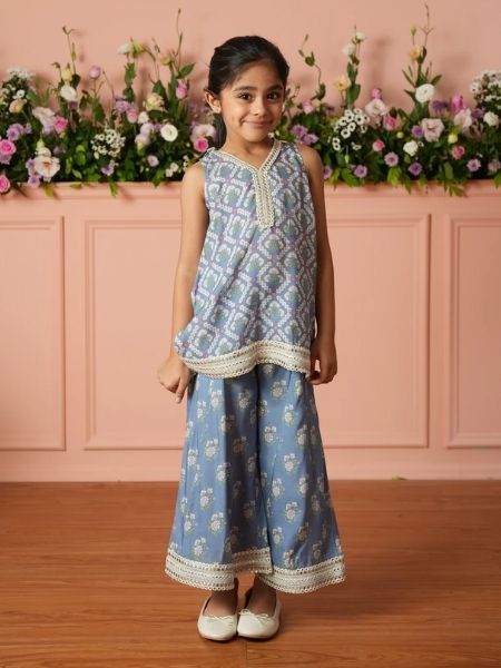 A Short Sleeveless Kurta Made From Soft Pima Cotton, The Blossom Kurti Has An A-Line Silhouette. It Is Embroidered With Floral Motifs All Over, Which Add Life To The Flattering Cut. The Mulmul Kurta Is Enhanced By The Organza Sandwiched Between A Thin Line Of Silver Gota And A Very Intricate Jaal Lace. The Drop Neck On The Kurta Adds To Its Feminine Charm. Complete The Look With The Blossom Sharara Pants In A Matching Tone, Making The Outfit Ideal For Mehndi Lunches And Wedding Functions.