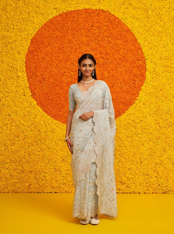 This radiant saree in mustard yellow is a true embodiment of traditional grace with a modern twist. The lightweight fabric is adorned with delicate floral motifs, in striking purple, scattered throughout, creating an intricate pattern that exudes charm and elegance. The highlight of the saree is the deep purple border, embellished with detailed embroidery and scalloped edges, adding a regal contrast to the vibrant mustard hue.