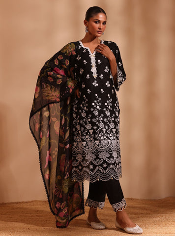 Playful and symbol of simplicity, this vibrant orange kurta set is an endearing ensemble for your festive and all-year-round wardrobe. It imparts a sense of understated elegance to the wearer. The notched neckline is accentuated with lace trim and delicate pearl hangings. With delicate eyelet embroidery in contrasting white all over and a scalloped hem, this is for the minimalist in you. Paired with straight pants, the main talking point of the set is its dupatta - a stunning printed masterpiece with a broad lace border.