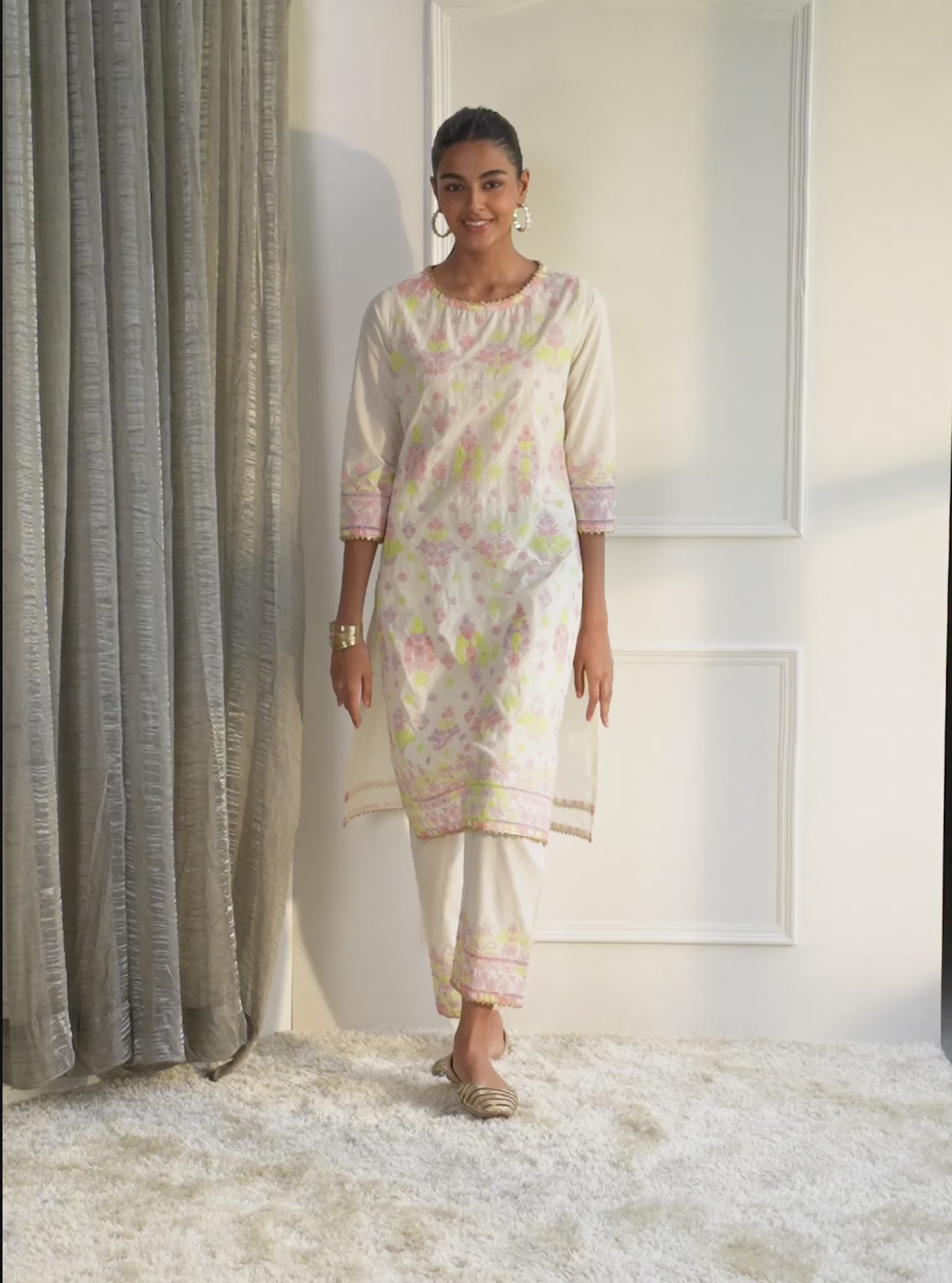 Mulmul Cotton Zahava Off White/Lilac Kurta With Zahava Off White/Lilac Pant