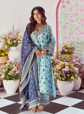 The straight-fit pants mirror the kurta’s embroidery at the hem, creating a seamless blend of design. Adding contrast and depth, the matching dupatta features dense embroidered borders and paisley-inspired motifs scattered across its body. Perfect for pre-wedding festivities or intimate celebrations, this ensemble balances grace and grandeur with effortless ease.