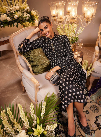 A fun and edgy take on your festive ensembles - fit for the fashion-forward in you! A full-sleeved collared shirt is paired with a stunning draped skirt. The entirety is adorned with tiny embroidery in white thread. The silhouette is chic, modern, and oh-so-stunning! You will be the show-stopper at any gathering.
