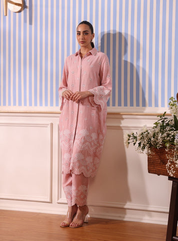 The kurta features a straight silhouette with a classic shirt collar and front placket, making it ideal for both casual days and elevated evenings. The trousers mirror the same embroidery and scalloped finish, transitioning from day to night with ease.