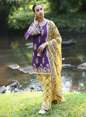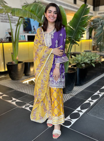 Bold, beautiful, and effortlessly elegant—this kurta set is a celebration of rich tradition and refined craftsmanship. The deep red kurta, adorned with intricate ivory embroidery, exudes regal charm, while the rust-toned palazzo and delicately embellished dupatta create a striking contrast. Designed for festive grandeur, this ensemble is perfect for wedding celebrations, pujas, and intimate gatherings.