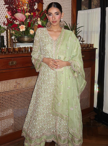 This exquisite kurta set embodies traditional elegance, perfect for festive occasions and celebrations. The kurta is crafted in soft green, and adorned with intricate white embroidery throughout, creating a subtle contrast against the base. The elaborate floral and jaali patterns lend an opulent feel, making this ensemble a true showstopper. The Anarkali style kurta features an open V-neckline, framed by gotta enhancing the neckline's elegance. The full-length sleeves and hemline are scalloped and adorned with gotta. The intricate details make this kurta a statement piece, ideal for making a lasting impression.