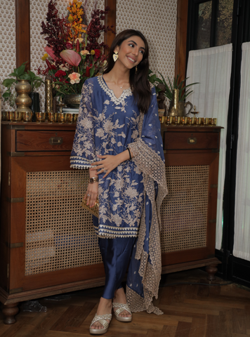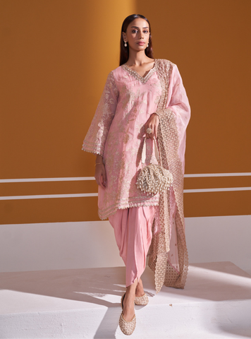 This stunning hued kurta set is a beautiful blend of rich tradition and contemporary elegance. The kurta is intricately adorned with golden thread work, featuring floral motifs. The V-neckline, framed with delicate embroidery, adds a refined touch, while the 3/4th sleeves are finished with ornate borders and intricate lace detailing for a regal look. The matching salwar is tailored for a comfortable silhouette. The set is elevated by the dupatta, exquisitely embroidered, and finished with a wide lace border that adds a touch of grandeur.?? ¨