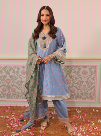 Unapologetically festive and beautifully bold, this deep red and orange embroidered suit is an exquisite ensemble for intimate wedding moments and vibrant rituals. The deep red kurta features intricate threadwork in rich tones, while the contrasting orange yoke panel adds a dash of traditional vibrance. Scalloped lace detailing on the sleeves and hemline heightens its ethnic charm. The ensemble is completed with solid red trousers and a beautifully embellished orange dupatta with zari motifs and chevron borders—perfectly balancing tradition with visual drama.
