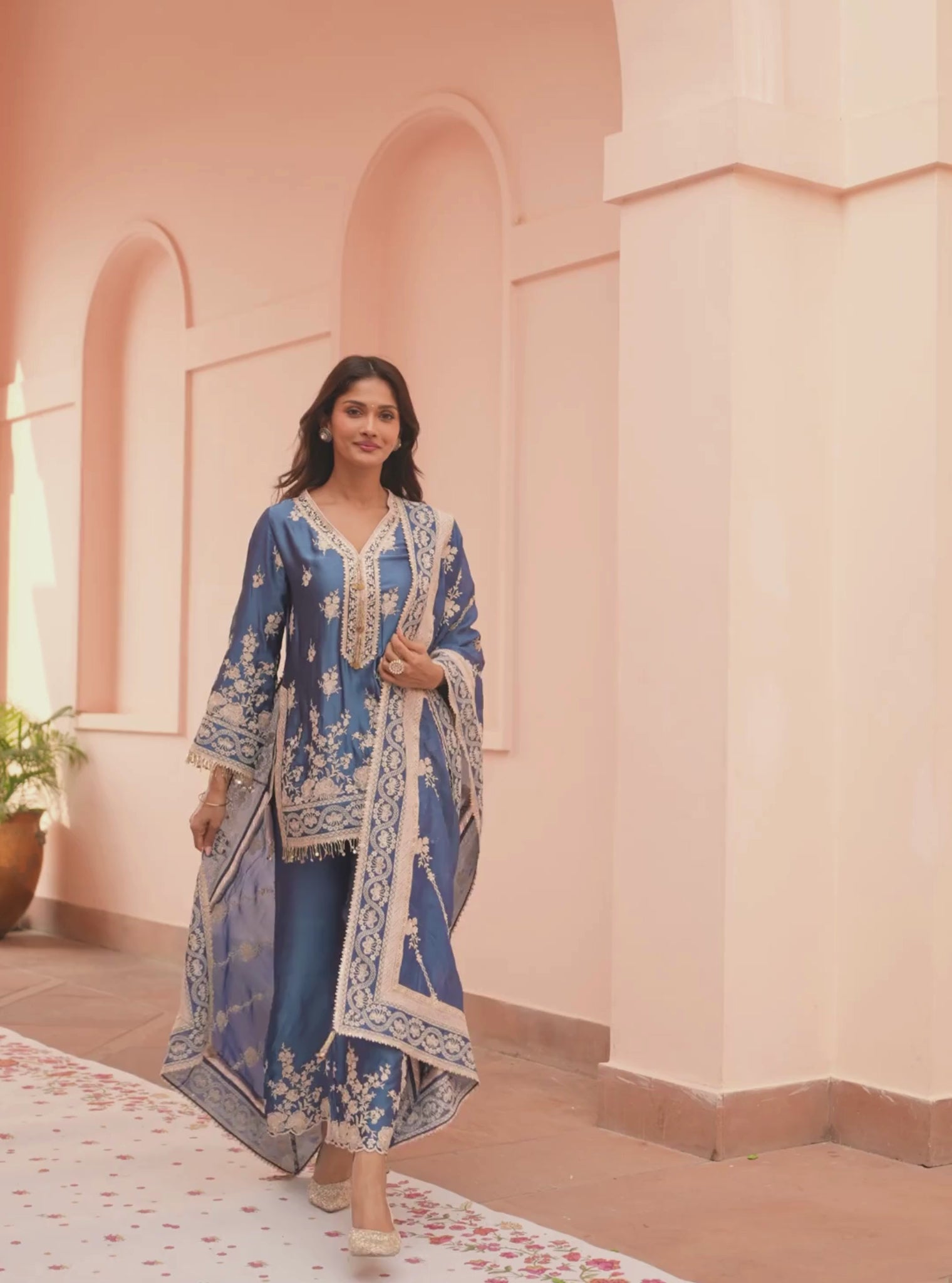 Mehrang Cupro Satin Blue Printed Shirt Set