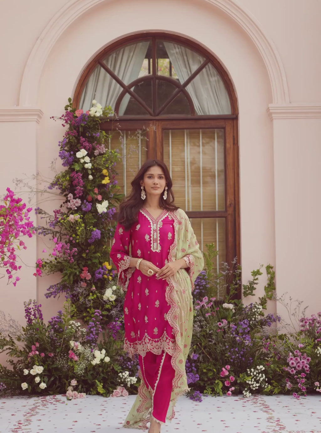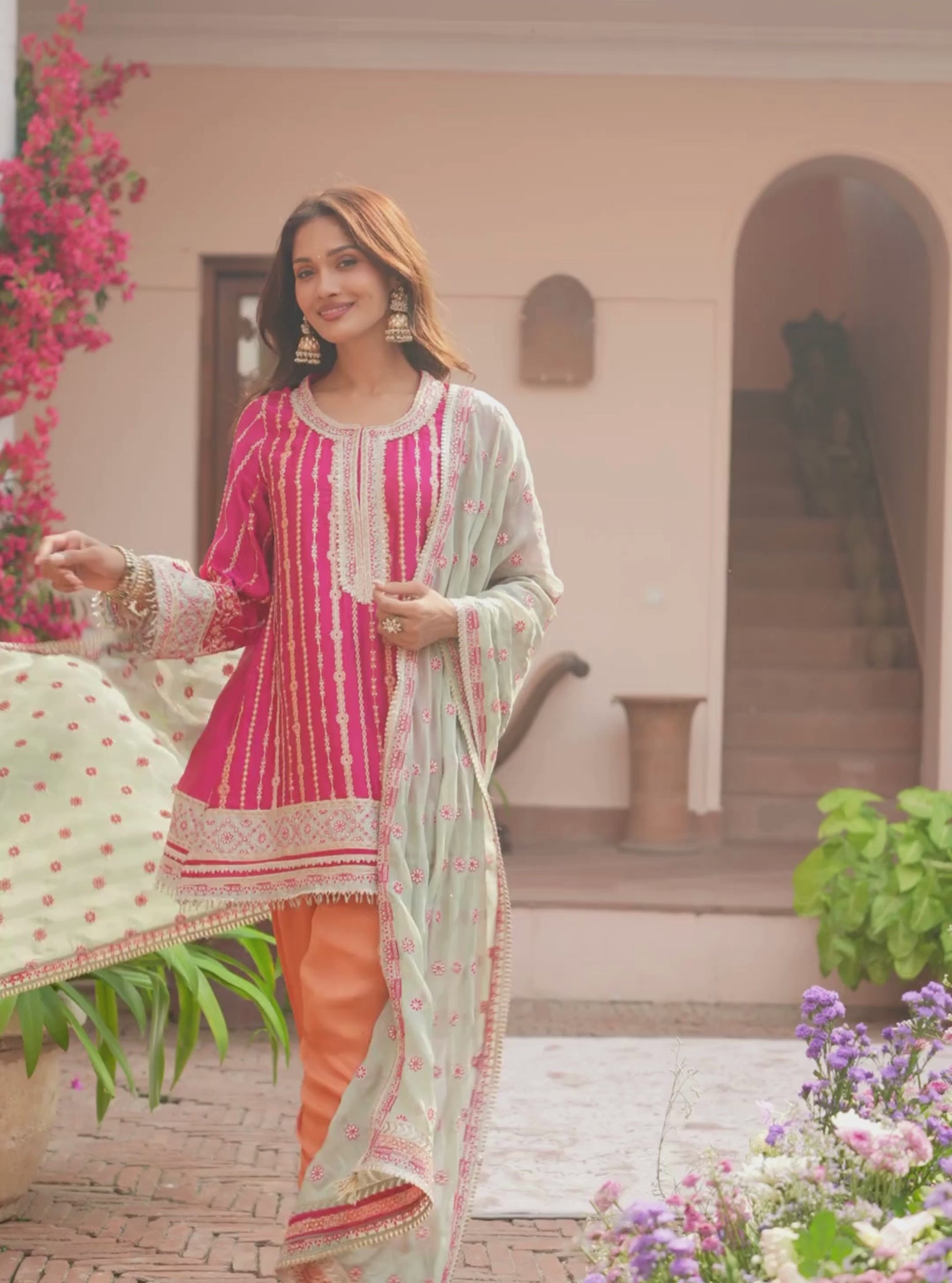 Phulkari Cupro Satin Rani Pink Kurta Set