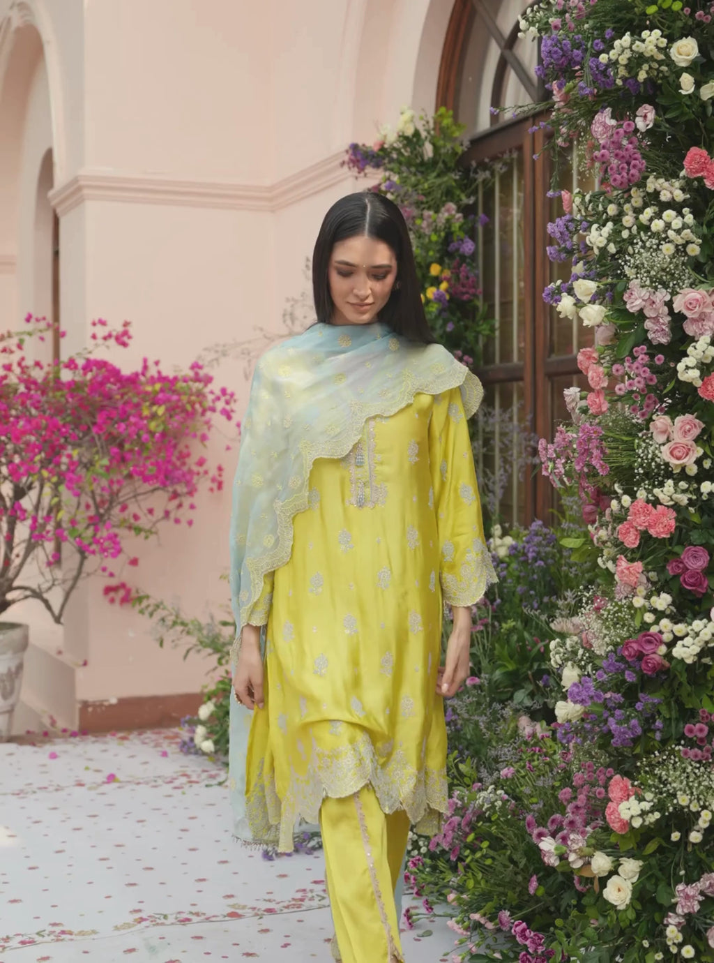 Phulkari Cupro Satin Lime Green Kurta Set