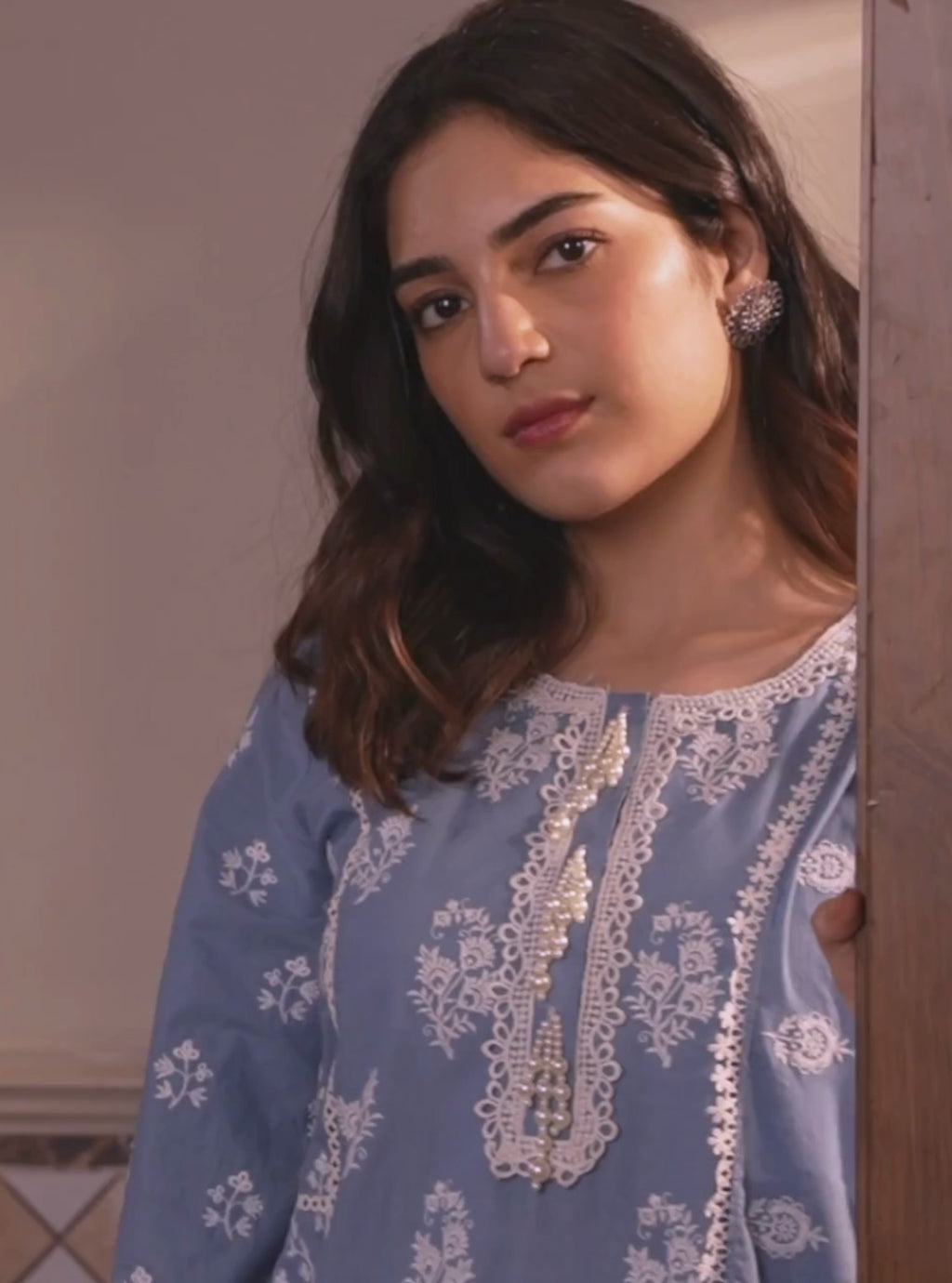 Mulmul Pima Satin Sol Denim Kurta With Mulmul Supima Cotton Sol White Pyajama