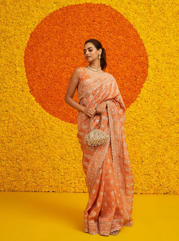 Step Into The Spotlight With This Elegant Saree, Exuding A Timeless Charm. Executed In A Rich, Burnt Orange, This Saree Is Adorned With Intricate Silver Zari Embroidery, Forming Delicate Regal Traditional Motifs All Along The Fabric. The Border Features A Detailed Pattern That Adds A Regal Touch To The Overall Design. Whether It'S A Grand Celebration Or An Intimate Gathering, This Saree Ensures Youƒ??Ll Be The Center Of Attention, Radiating Grace And Poise.