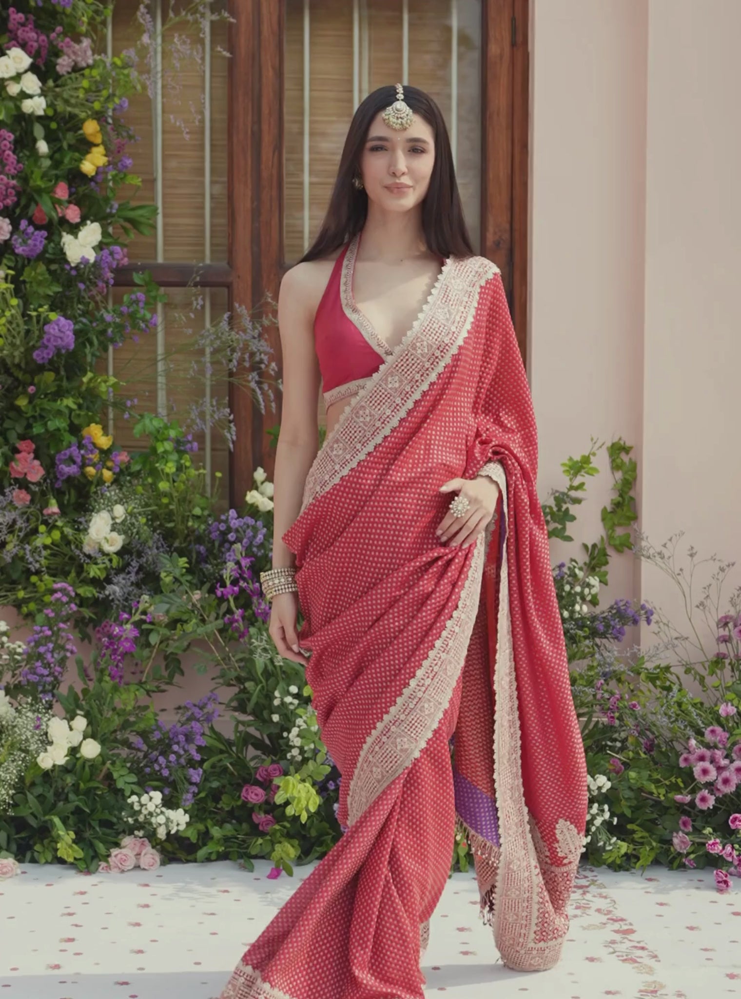 A classic festive saree crafted in Banarasi fabric with delicate polka dot detailing that adds depth without overpowering the look. This Red saree drapes fluidly while holding its structure, making it ideal for long celebrations. Finished with an intricately detailed border that lends richness in a restrained way. Paired with a smooth Pima Satin blouse for comfort and contrast.