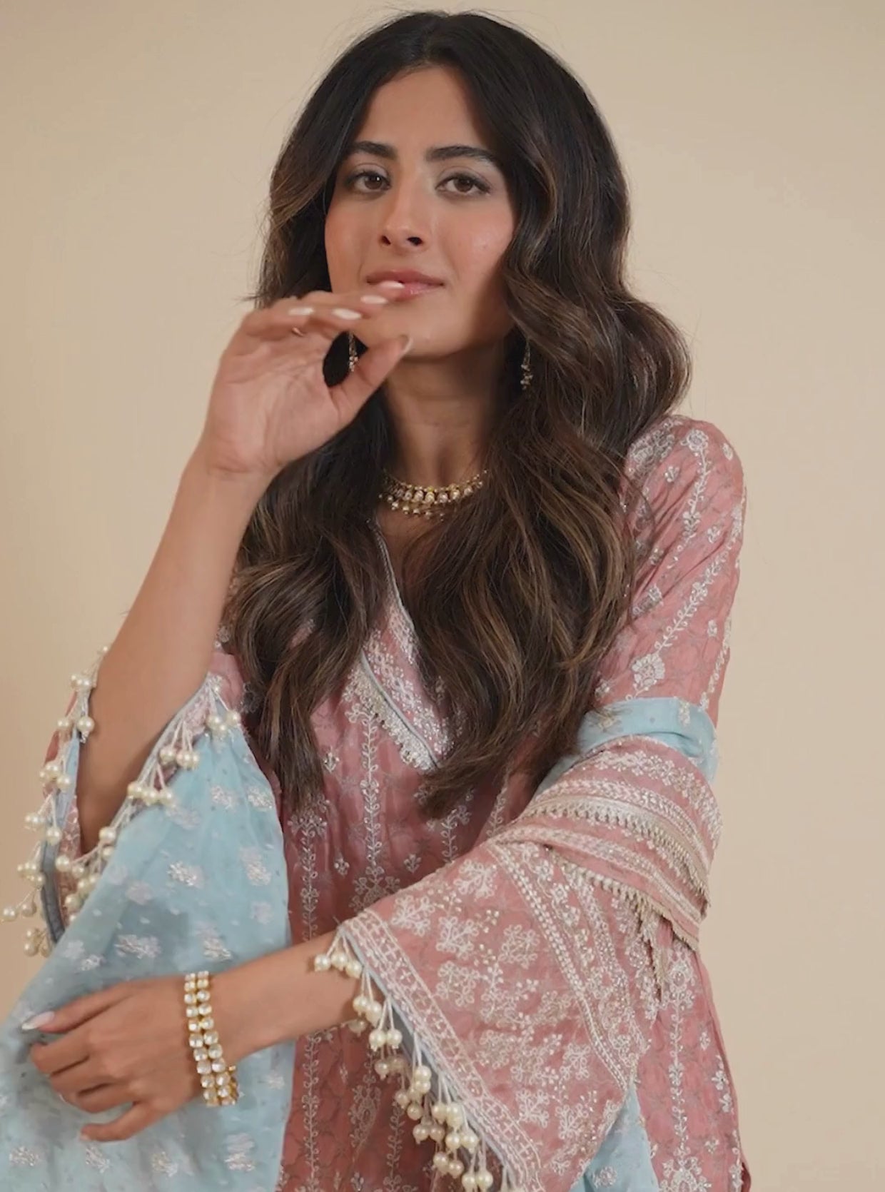 Soft, Sophisticated, And Steeped In Tradition — This Blush Pink Kurta Set Is Perfect For The Modern-Day Wedding Guest Who Loves Subtle Glamour. Adorned With Intricate Threadwork And Delicate Motifs, The Kurta Flows Effortlessly Into A Gracefully Flared Sharara. The Powder Blue Dupatta Edged With Dainty Tassels, Adds A Refreshing Contrast And An Extra Dose Of Grace.