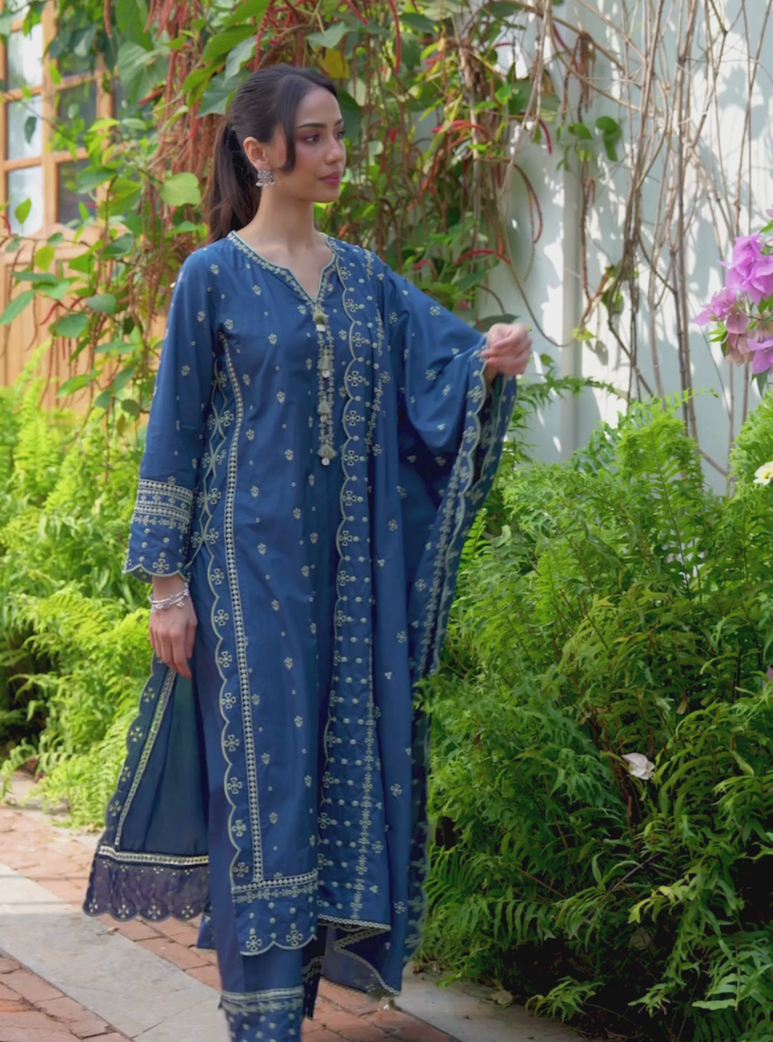 Crafted in premium Supima cotton, this kurta features intricate contrast detailing across a deep navy base. The straight silhouette is paired with coordinated pants and a printed dupatta. Structured yet breathable, it’s suited for small festive occasions, dinners, and at-home celebrations.