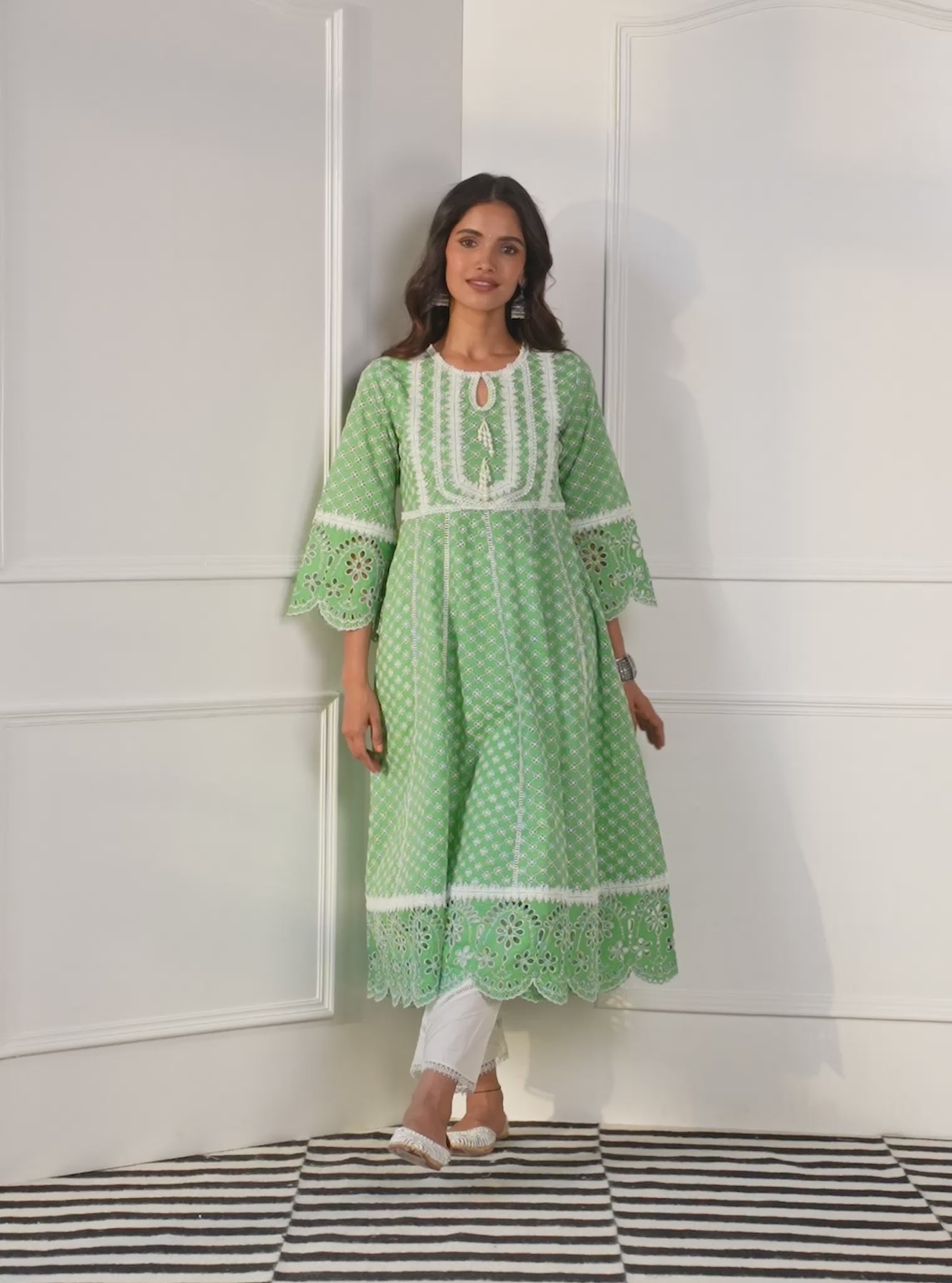 Mulmul Cotton Arris Green Anarkali Kurta With Diagonal Pintuck White Pant