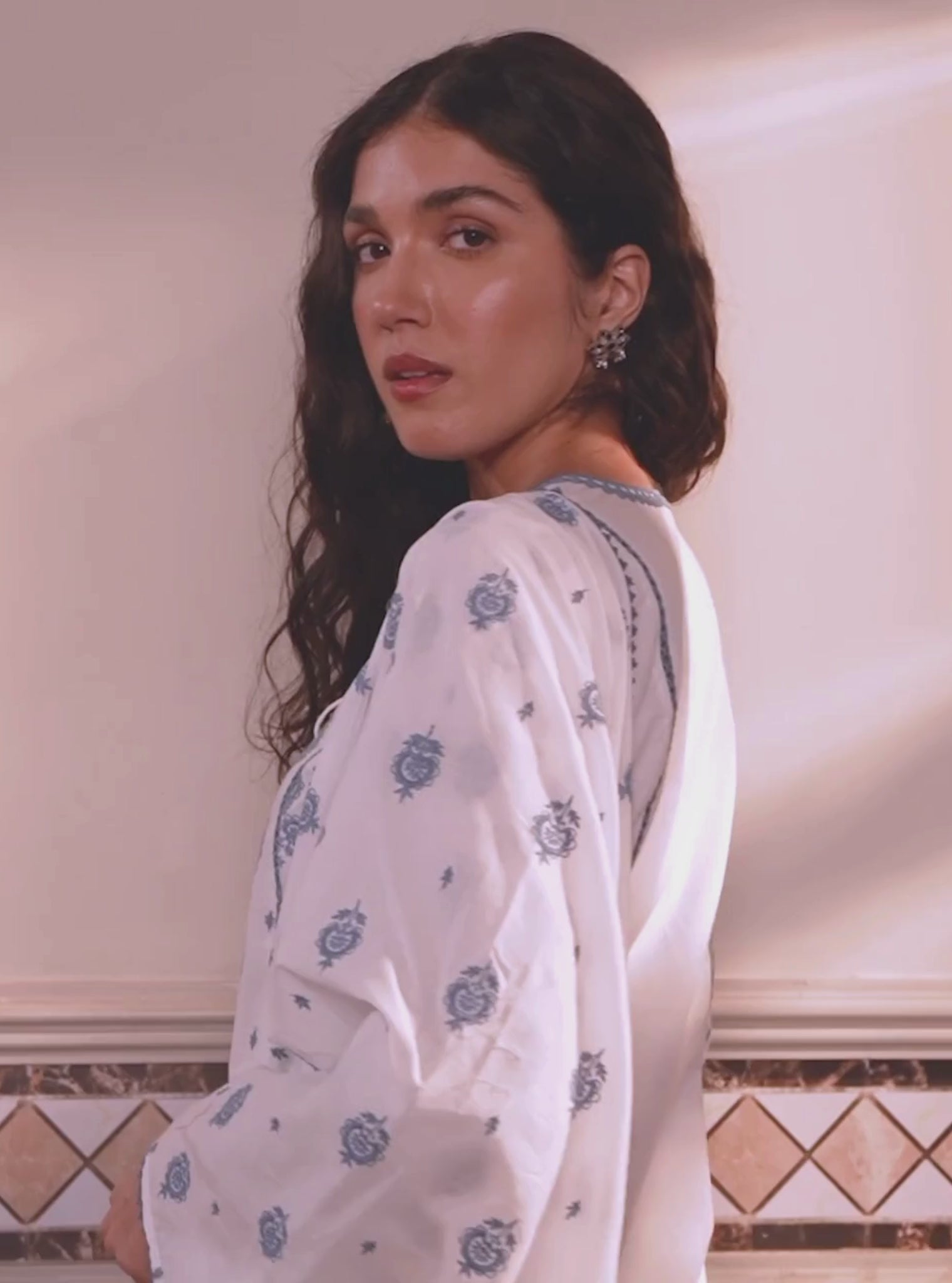 Mulmul Cotton Dinaz White LBlue Kurta With Mulmul Cotton Dinaz White LBlue Pant