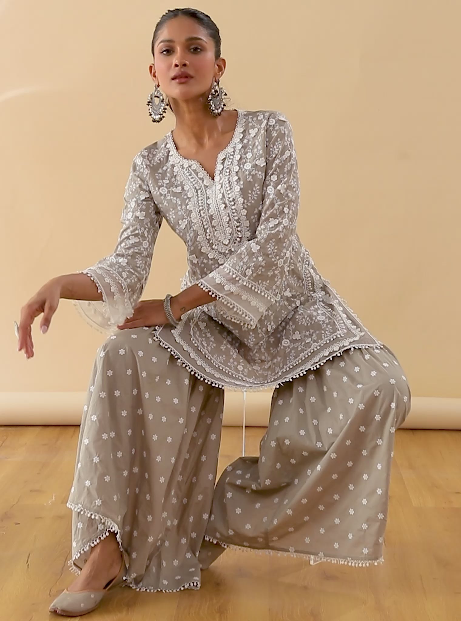 The kanji set in the sophisticated shade of grey is a statement for the summer, featuring a short kurta with running floral embroidery enhanced by appliqu?Ÿ’???ƒ???Ÿƒ?????? floral motifs, bell sleeves with organza panels and double lace trims, and a hemline with minimal lace work to bring a balance. The set comes with a coordinated garara in grey with tiny floral motifs.