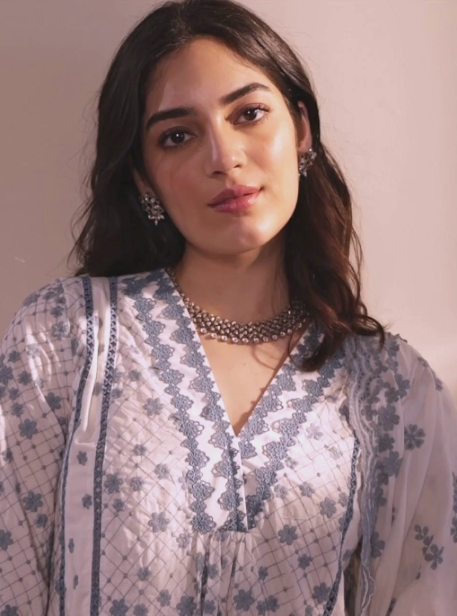 A Sophisticated White And Blue Anarkali Ensemble Exquisitely Embellished With Intricate Blue Thread Embroidery Throughout. The V-Neckline Is Gracefully Accented With Delicate Blue Lace, Complementing The Floral Jaali Embroidery That Adorns The Entirety Of The Kurta. A Touch Of Elegance Is Added To The Hemline With A Lace Trim.