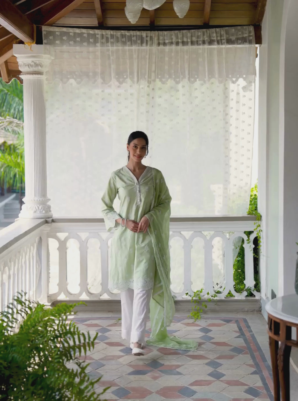 Fresh and graceful, the Leniya kurta set is crafted in breathable Supima cotton for everyday comfort. The straight kurta features delicate printed motifs and subtle detailing that frame the silhouette with understated elegance. Paired with comfortable cotton pants, the ensemble is completed with a lightweight organza dupatta featuring coordinated Leniya prints that add softness and movement. Perfect for warm days, daytime gatherings and relaxed celebrations.