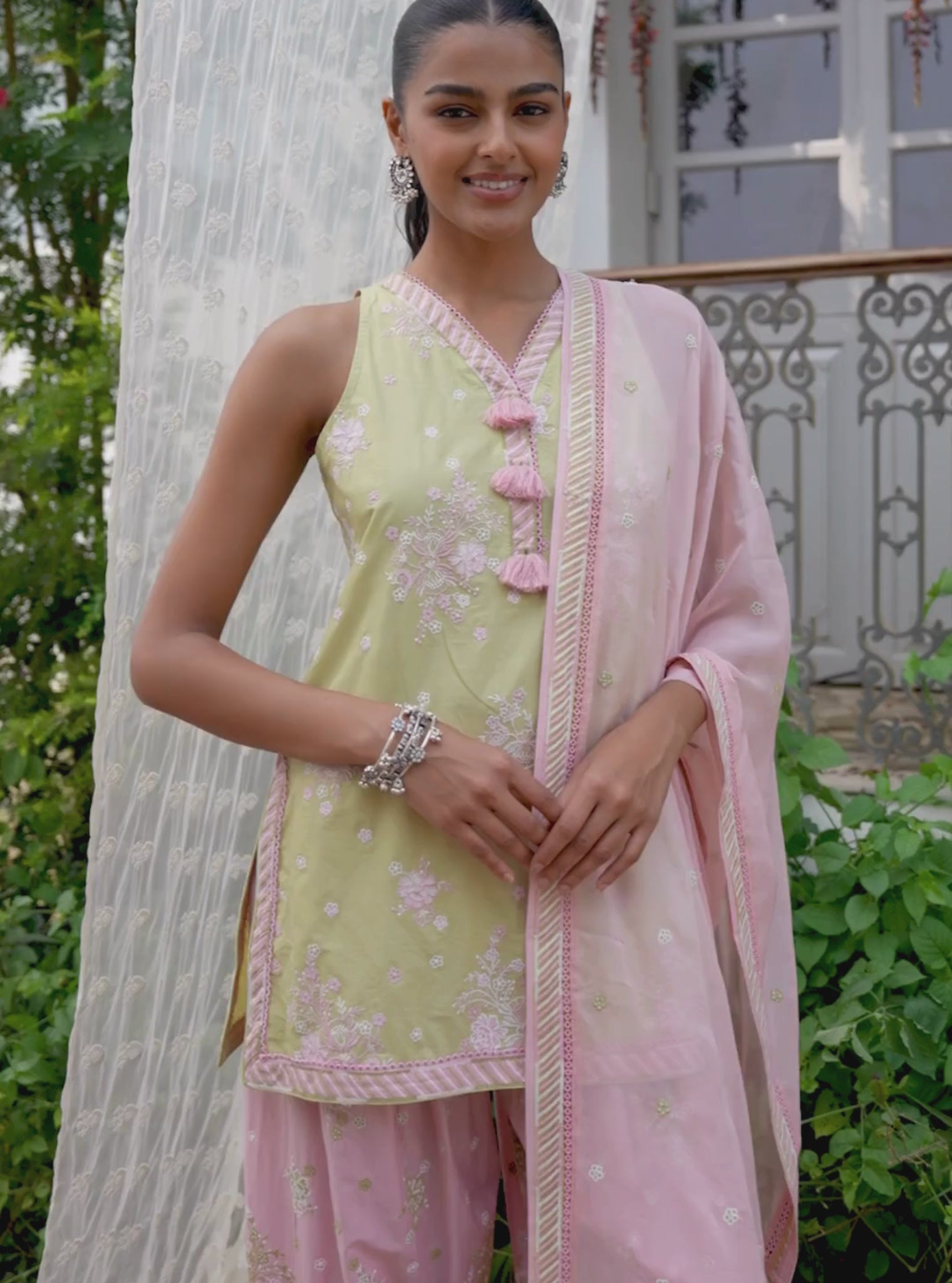 Fresh and feminine, the Liva kurta set is crafted in soft Supima cotton that feels light and breathable through the day. The kurta features delicate printed detailing and subtle accents that lend the silhouette a soft charm. It is paired with comfortable pink cotton salwar pants that create a playful colour contrast. The look is finished with a flowing organza dupatta featuring matching Liva prints. Perfect for daytime occasions, festive brunches and summer gatherings.