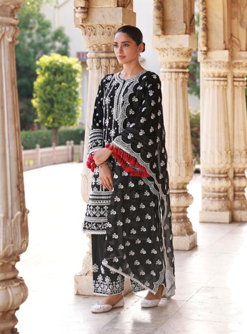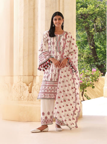 Rendered in soft Mulmul cotton, the Lomeya Kurta Set in White & Blue is a monochrome daydream. Intricately embroidered in deep navy and powder blue thread, it features floral and vine motifs throughout. The round neckline is highlighted with a split placket and tonal lacework. What truly sets this set apart is the bell sleeves; finished with multi-panel embroidery, looped lace, and metallic gold-beaded tassels for a luxe handcrafted finish. The matching pants are embroidered along the hem and scalloped with lace trims. A matching printed organza dupatta with scalloped borders completes the look; it's lightweight yet statement-making.