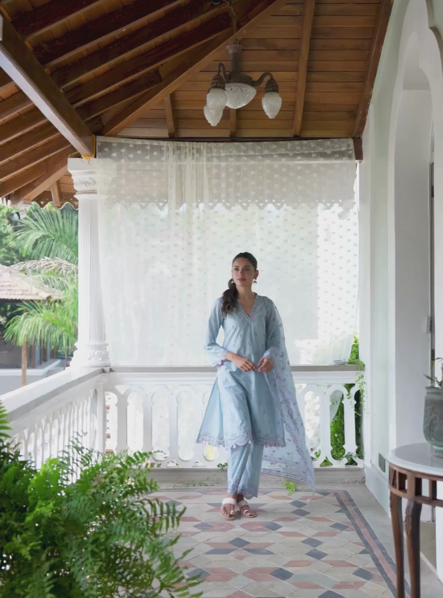 Designed in soft Supima cotton, the kurta features subtle printed detailing with a straight, relaxed fit. Paired with matching straight pants and a lightweight dupatta, the set feels breathable and easy. The powder blue tone works well for everyday dressing, intimate gatherings, and casual hosting