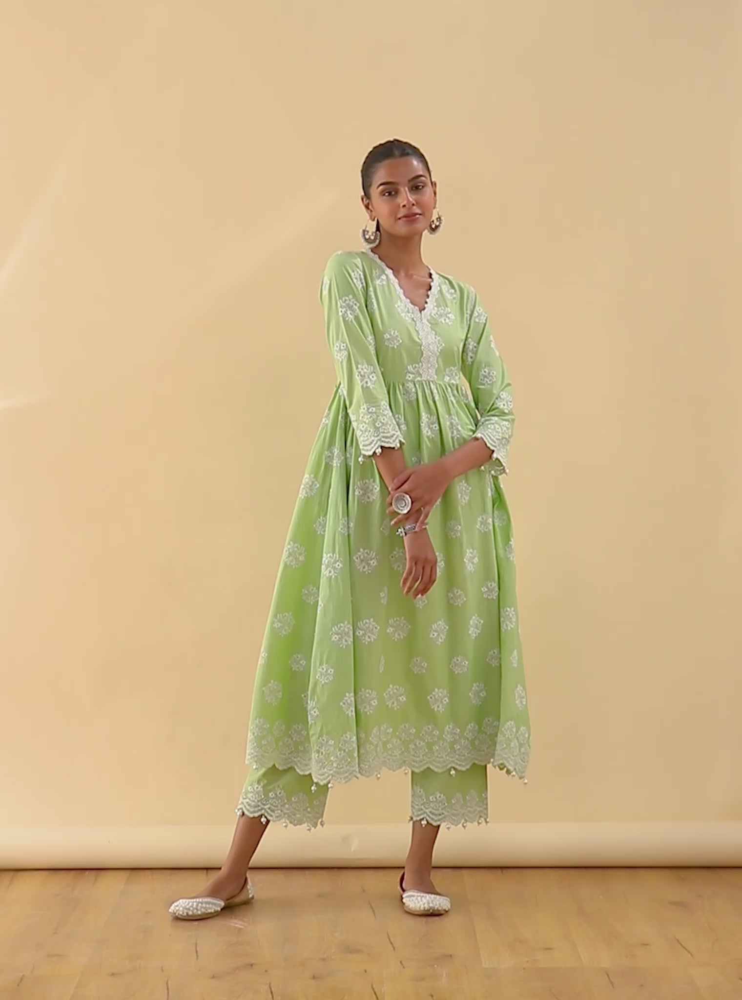 Mulmul Cotton Malana Green Kurta With Malana Green Palazzo