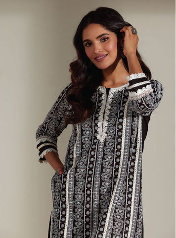 The Patricia set is one that goes all out while being sophisticated and subtle all at once, perfect for the mornings but equally well balanced for the evenings! The straight silhouette kurta has small vertical panels of a variety of embroidery through the length and is enhanced with the floral lace on the necklines and the hems. Finish the look with straight white pants of complimenting multi-lace detailing and the very pretty shiloh dupatta in the same shade.