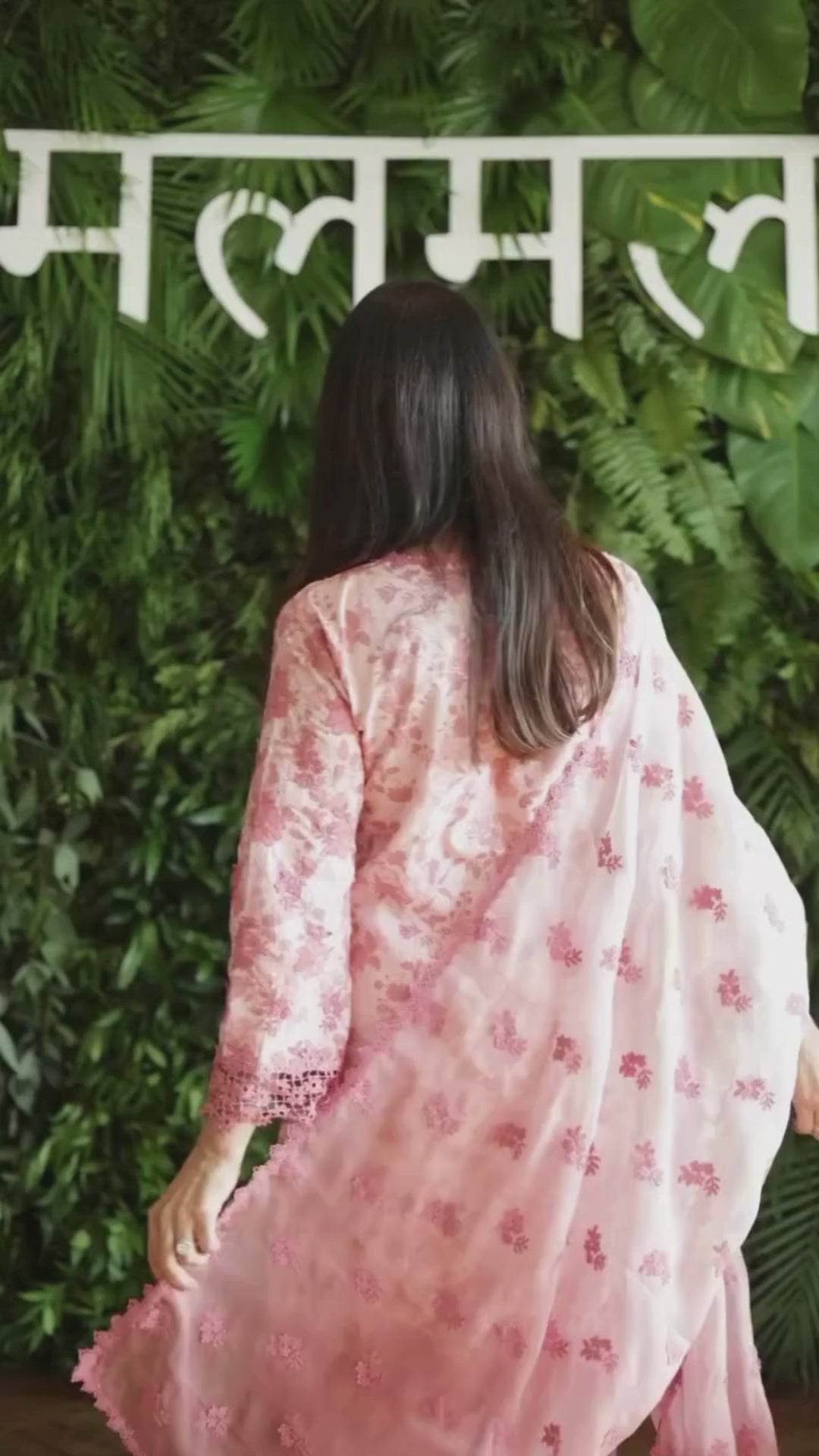 Paired with straight-fit white pants adorned with matching pink lace at the hem, the ensemble strikes a balance between sophistication and ease. The coordinating dupatta, with its subtle floral patterns and lace-accented borders, completes the look. This kurta set is a go-to choice for brunches, garden gatherings, or casual outings, offering a blend of charm and comfort for sunlit days.