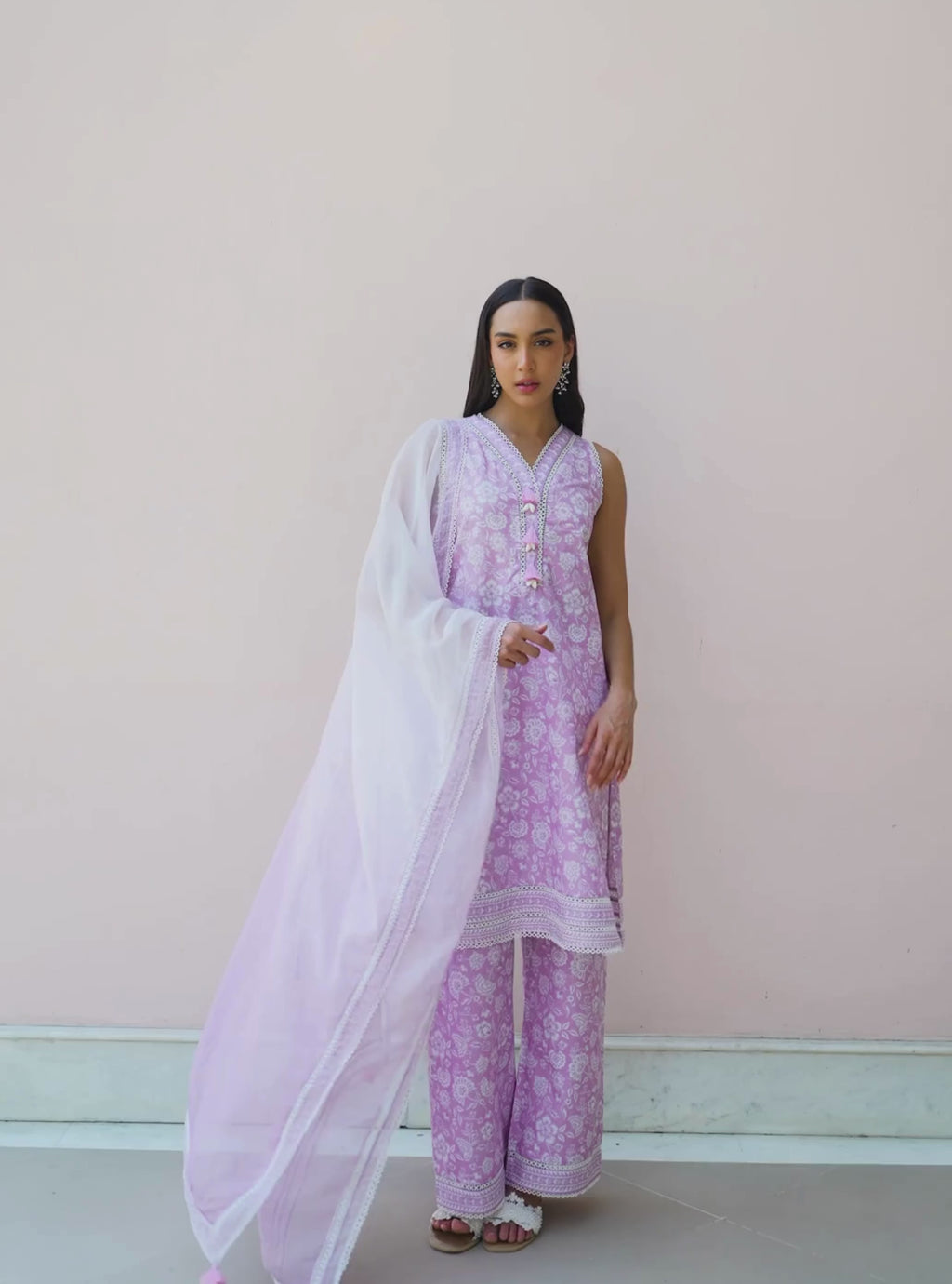 The Aubriet Kurta Set In Lilac Is Crafted In Soft Mulmul Cotton With An All-Over Gadh-Inspired Print And A Mid-Length Silhouette. The Kurta Features A Y-Placket Neckline Finished With Shell And Thread Tassels, Along With Delicate Ladder Lace Inserts And Geometric Borders At The Hem. It'S Paired With Coordinated Printed Pants That Mirror The Same Lace Detailing. The Look Is Completed With An Ombré Organza Dupatta In Soft Gradients Of Lilac, Trimmed With Lace And Thread And Shell Tassels.