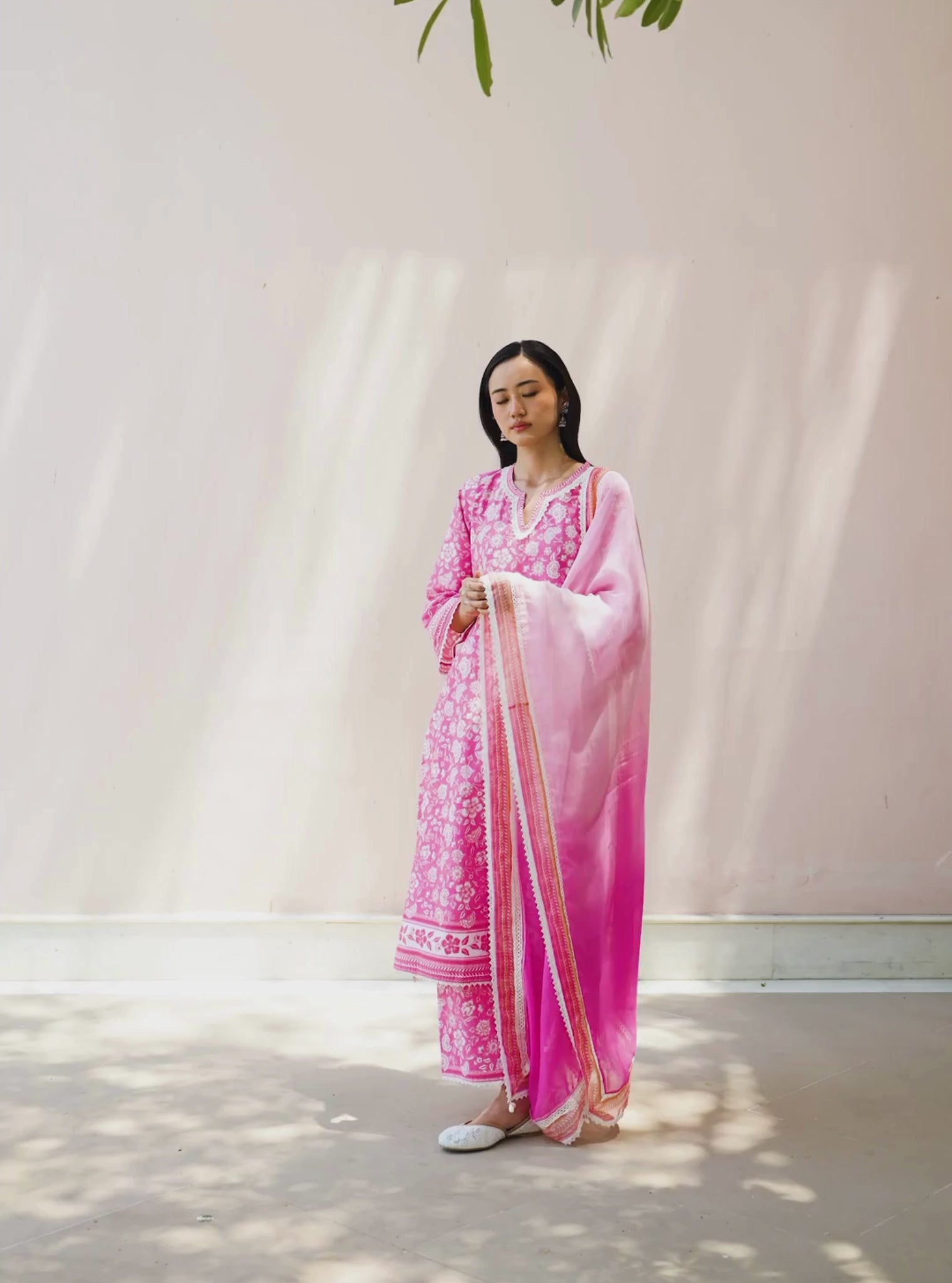 The Rosabelle Kurta Set In Rani Pink Comes With A Straight-Cut Kurta With Delicate All-Over Gadh Inspired Print And Scalloped Lace Detailing Along The Hem, Sleeves, And Neckline. Made With Breathable Mulmul Cotton, It’S Paired With Matching Printed Pants And A Soft Organza Dupatta In Powder-To-Dark Blue Ombré. Finished With Shell Tassels, Geometric Organza Border, And Lace Trims.
