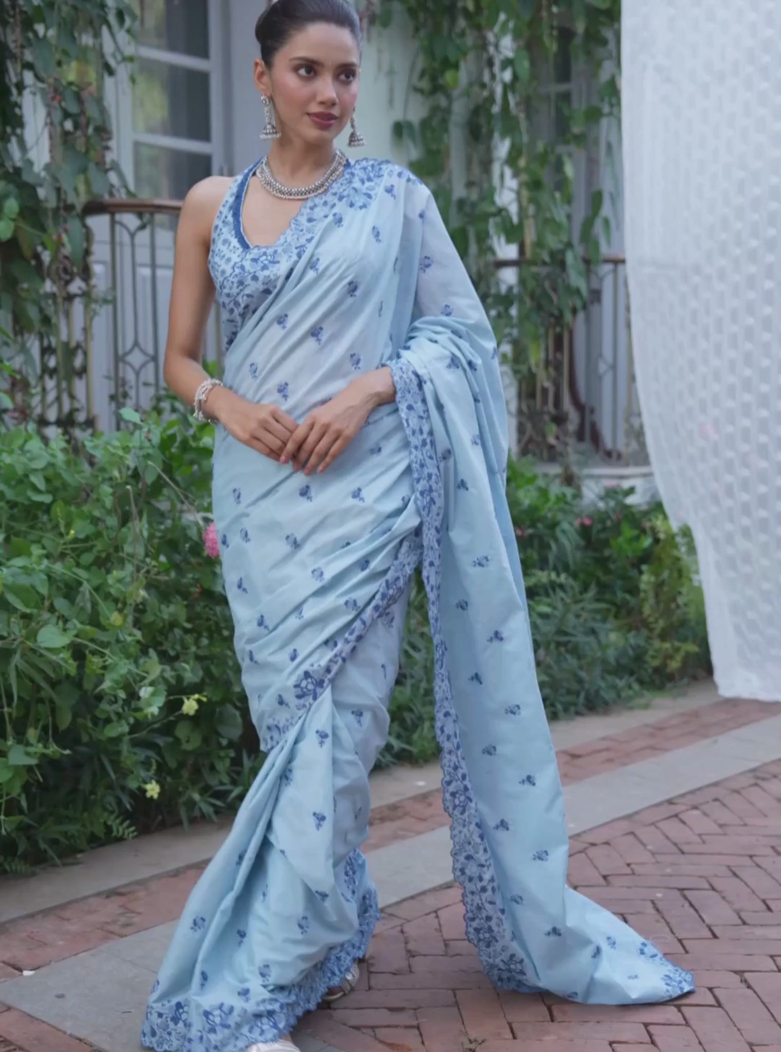 Crafted in soft cotton, this saree features delicate embroidered detailing across a light blue base, paired with a matching blouse. Lightweight and breathable, it drapes with ease. Ideal for small gatherings, hosting, and day celebrations.