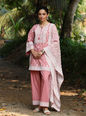 Embrace summer with this classic black and white kurta set, a perfect blend of comfort and tradition. The relaxed-fit short kurta, adorned with delicate black-threa embroidery, exudes an understated charm that is both timeless and versatile. Framed with intricate geometric borders and a tie-up neckline with tassels, this piece brings an artisanal touch to everyday dressing. Paired with broad palazzo pants, this set offers a breezy silhouette, making it an ideal choice for warm summer days. The coordinating dupatta, adorned with intricate patterns and a striking contrast border, adds a regal flair to the ensemble.