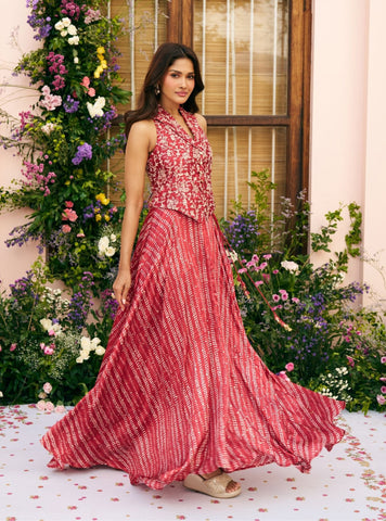 A coordinated waistcoat and skirt set in signature Badami print, cut in soft cupro satin for fluid drape and comfort. The sleeveless waistcoat is tailored for a flattering shape, offering structure without stiffness. It is paired with a sweeping, flared skirt that enhances movement and creates a balanced proportion.