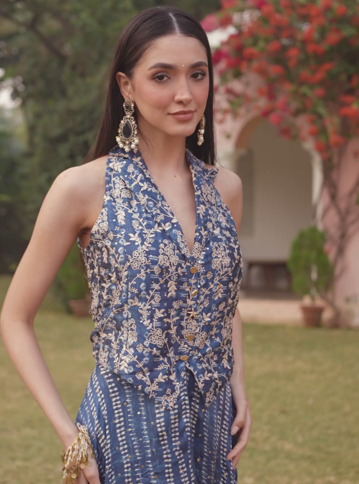 Badami Cupro Satin Printed Navy Waistcoat with Skirt