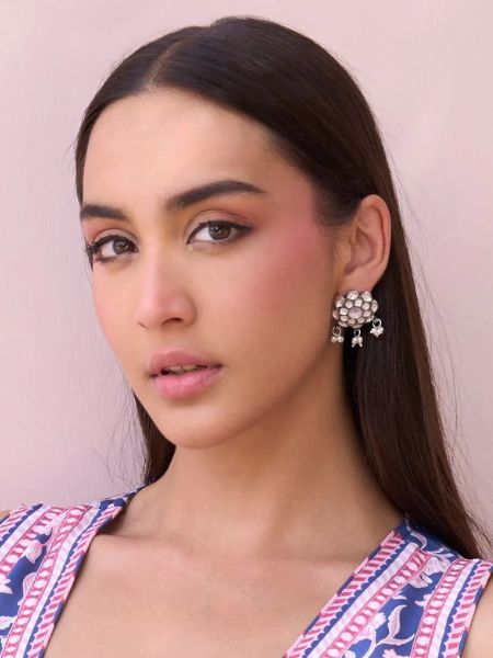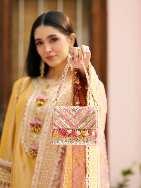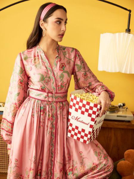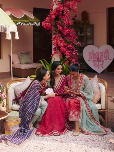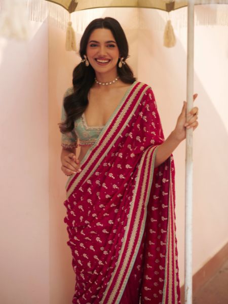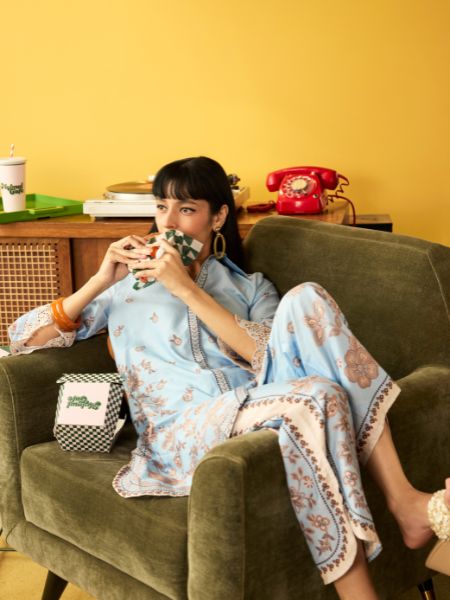 A red Ajrakh-printed kurta set finished in smooth cupro satin. The kurta features ornate yoke detailing and contrast borders, paired with printed pants and a lightweight organza dupatta for an effortlessly dressy ensemble with traditional charm.