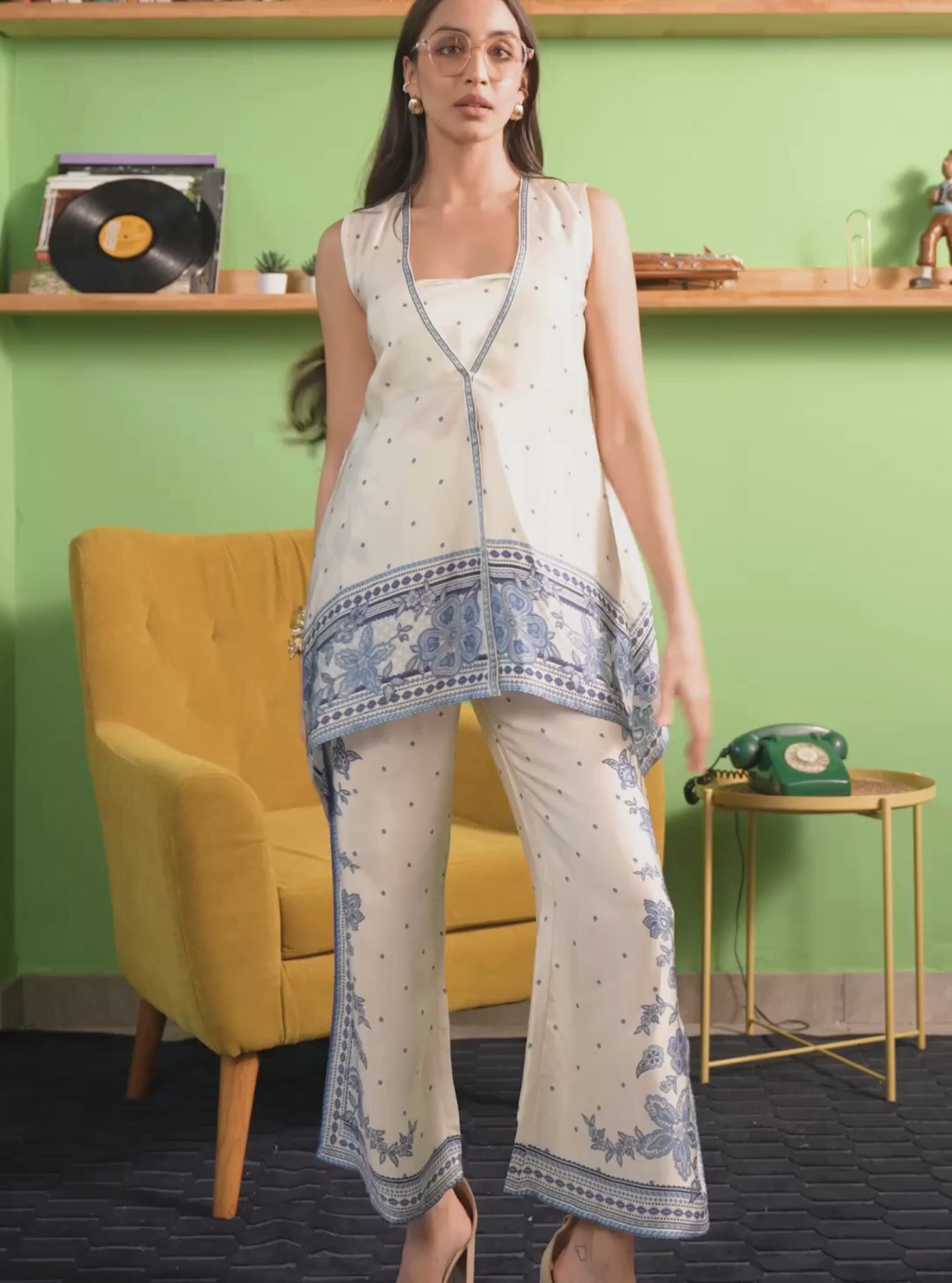 A coordinated top-and-pant set crafted in smooth cupro satin with a soft printed finish. The Saroja silhouette features a relaxed, elongated top paired with fluid pants, allowing for easy movement and all-day comfort. Light on the body with a subtle sheen, this set works well for festive lunches, intimate celebrations, and elevated daytime occasions.