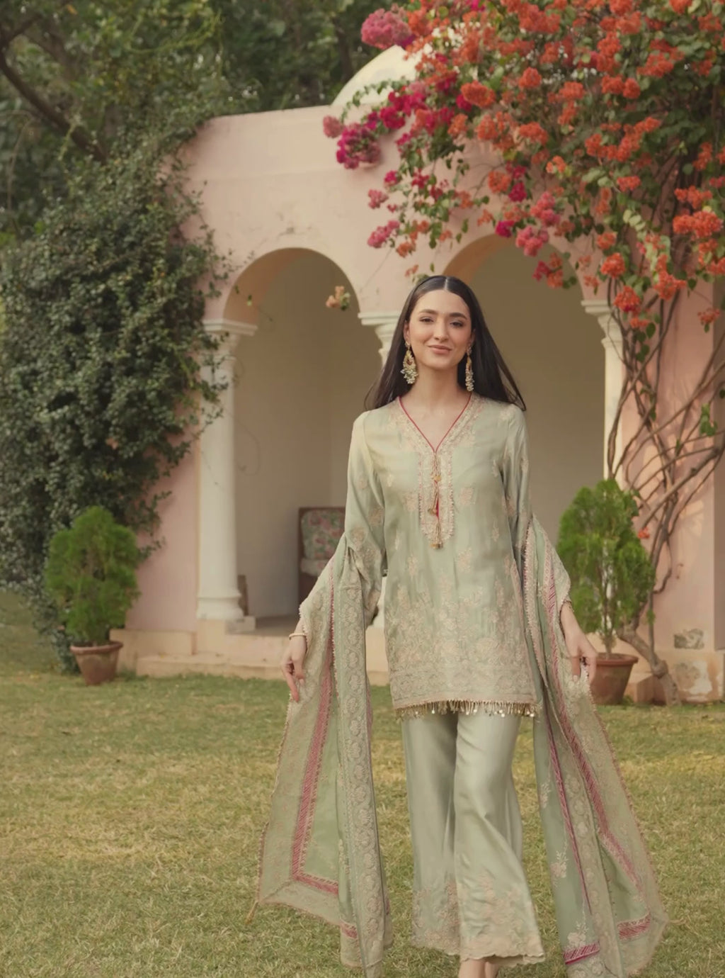 A refined festive set crafted in fluid Cupro Satin with a soft, luminous finish. The kurta features intricate embroidery along the neckline and hem, designed to add detail without heaviness. Paired with matching Cupro Satin pants that drape effortlessly and allow easy movement. Finished with a coordinated dupatta that completes the look with subtle contrast.