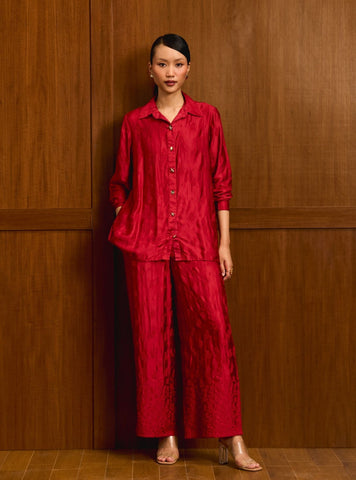 A relaxed shirt-and-pant set crafted in smooth cupro satin with a soft, fluid finish. The Santree silhouette is designed for ease, offering a clean structure that drapes comfortably on the body. The champagne tone keeps it understated yet occasion-appropriate, making it suitable for wedding events, festive evenings, and elevated day functions.