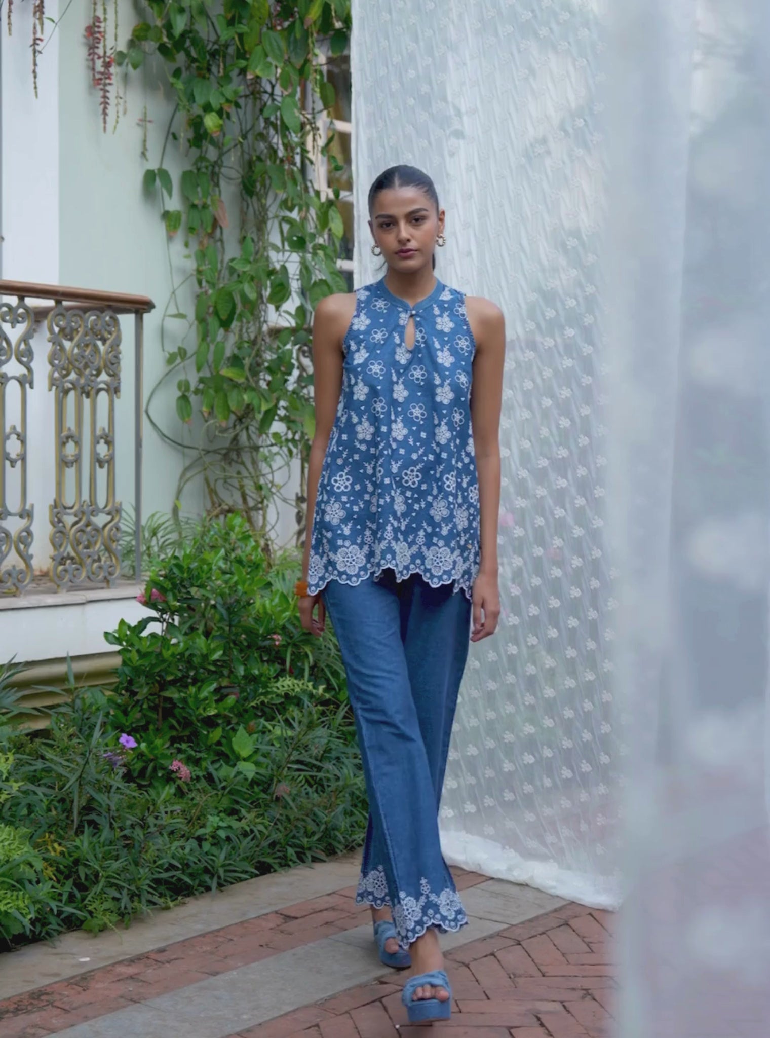 A sleeveless denim top with a high neckline and keyhole detail, paired with straight-fit pants. Finished with fine embroidery and a scalloped hem for subtle detail. Light, fuss-free, and suited for warm days, casual outings, or easy hosting.