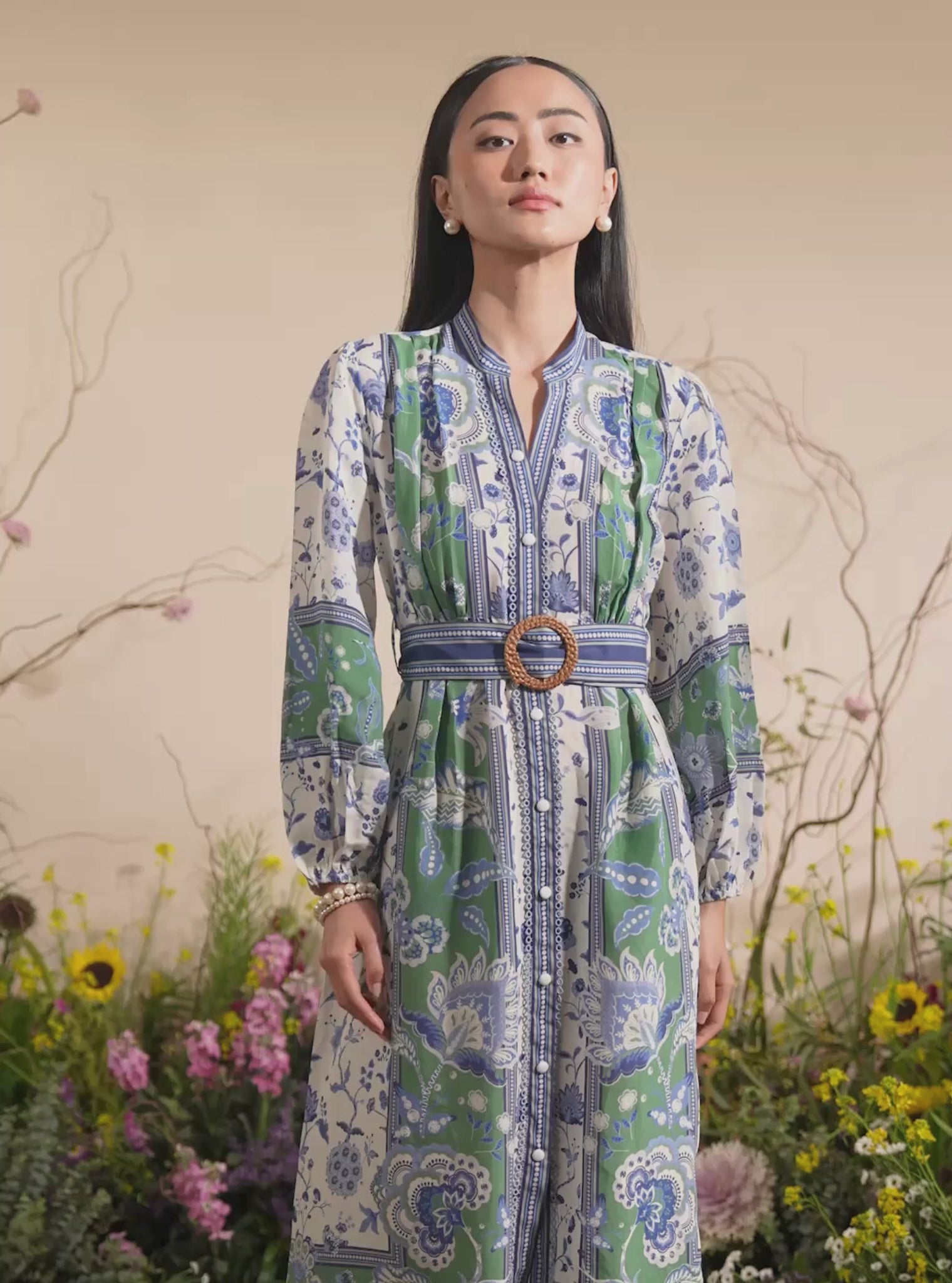 Embrace the spirit of summer with this stunning Bohemian-inspired maxi dress. Featuring a striking blend of blue and green floral prints, this dress effortlessly fuses tradition with contemporary style. The waistline is cinched with a belt,creating a silhouette. Full sleeves and intricate border details add a refined touch to the laid-back vibe. Perfect for garden parties, brunches, or a breezy coastal escape—this piece is your go-to for timeless elegance with a modern twist.