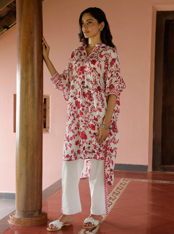 This Breezy And Contemporary Kurta Set Is A Perfect Pick For Casual, Laid-Back Summer Days. The Kurta Is Designed On A Fresh White Base, Featuring Bold Blue Floral Prints That Create A Visually Striking Contrast. The Intricate Blooms In Shades Of Blue And Indigo Are Both Elegant And Calming, Bringing A Serene Vibe To The Piece.