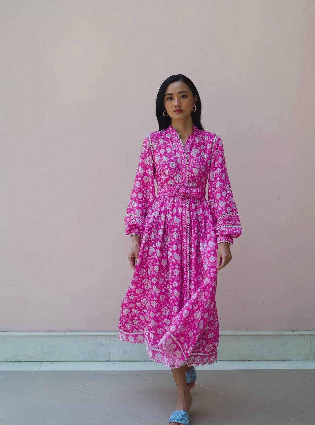The Selbourne Dress In Pink Is Crafted In Breathable Printed Lawn With An All-Over Gadh-Inspired Motif And Intricate Ladder Lace Detailing Running Through The Sleeves And Bodice. It Features Soft Balloon Sleeves, A Scalloped Hem, And A Detachable Fabric Belt To Cinch The Waist.