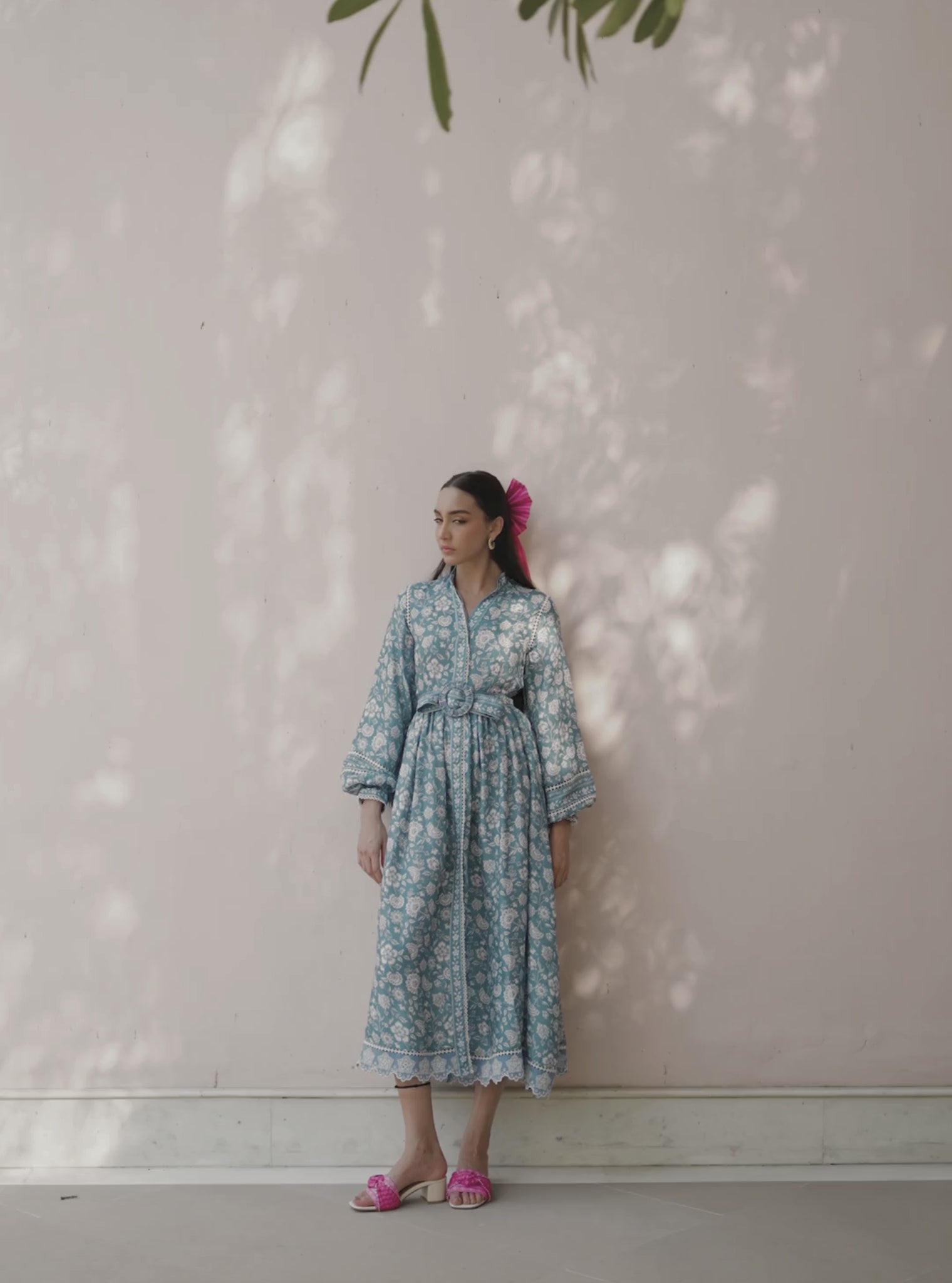 The Selbourne Dress In Steel Blue Is Crafted In Breathable Printed Lawn With An All-Over Gadh-Inspired Motif And Intricate Ladder Lace Detailing Running Through The Sleeves And Bodice. It Features Soft Balloon Sleeves, A Scalloped Hem, And A Detachable Fabric Belt To Cinch The Waist.