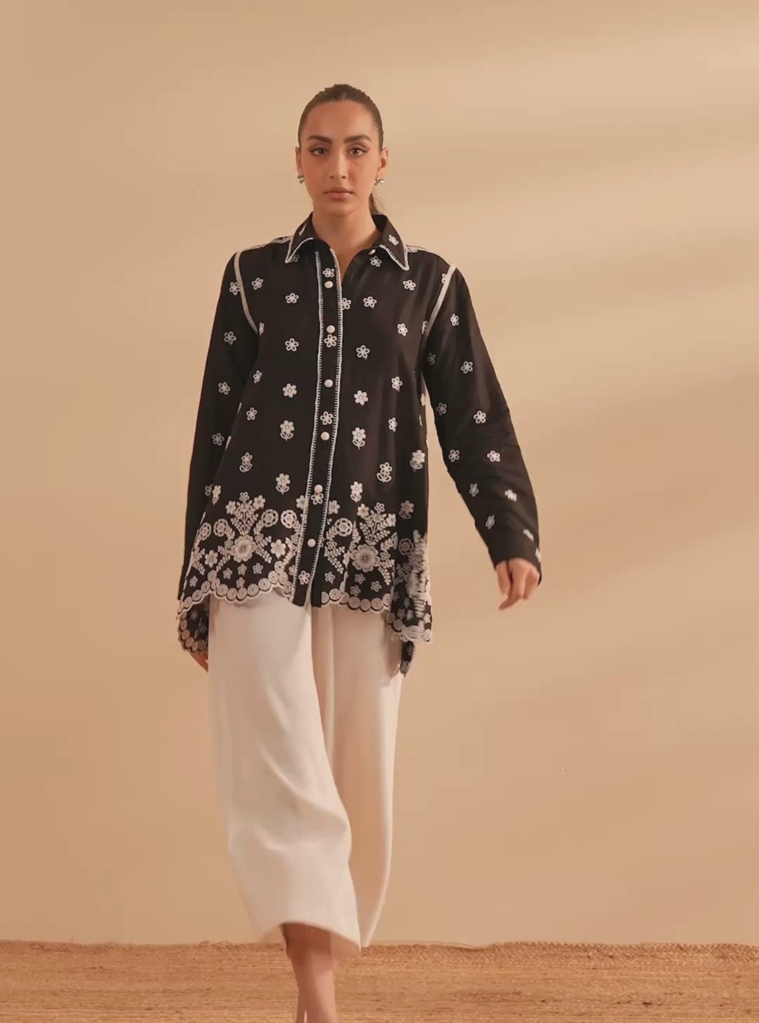 Crafted in soft, breathable linen, this shirt is elegance in its most effortless form. The classic black base is adorned with intricate embroidery along the scalloped hemline. Featuring a classic collared neckline and relaxed A-line silhouette, this piece blends comfort with understated sophistication.