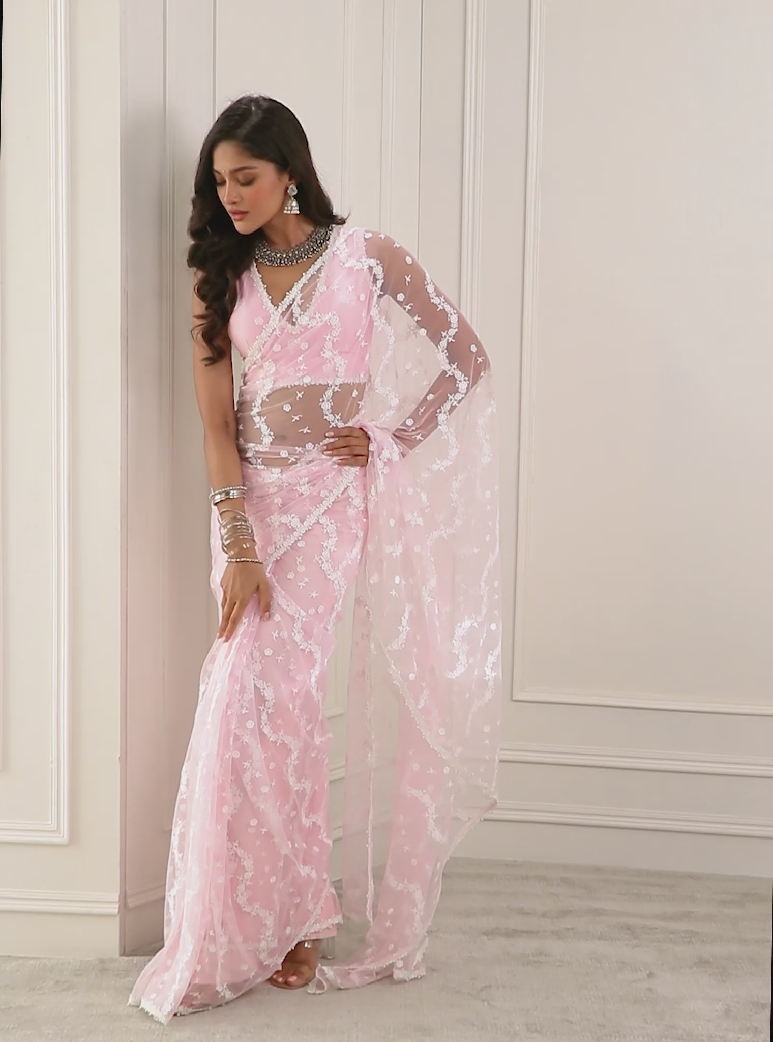 The dainty net saree is designed for summer weddings in the most refreshing shades with a unique combination of running embroidery and delicate motifs, finished with a unique floral lace trim border.