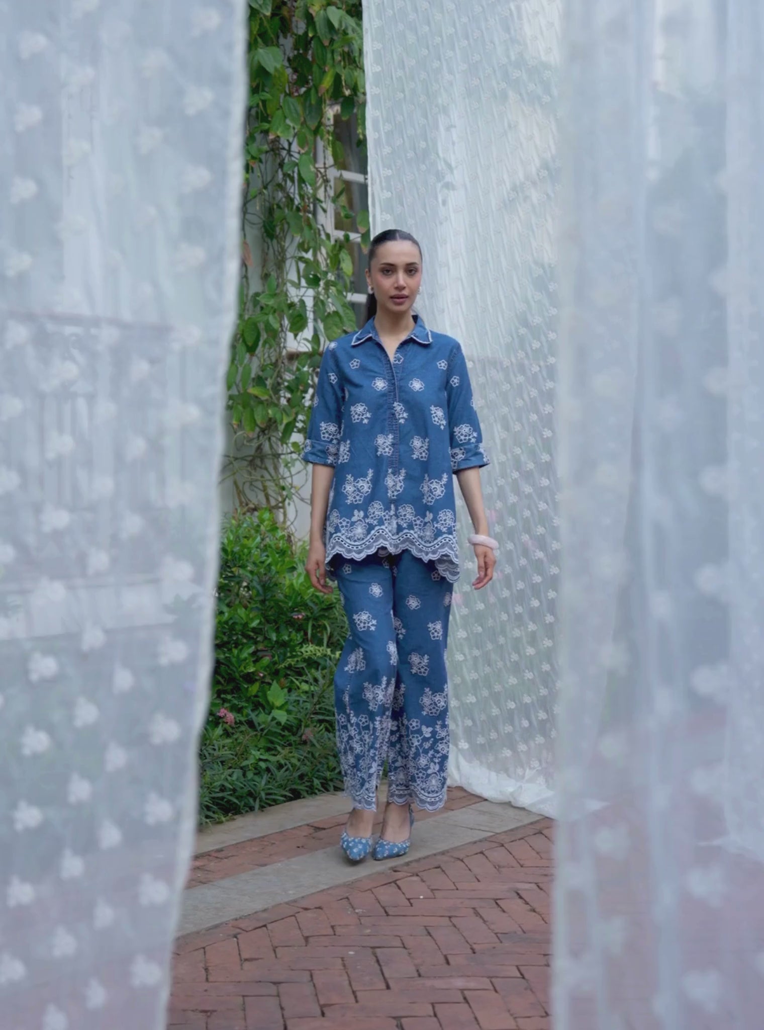 The Omika denim shirt is paired matching flared pants. Designed with scattered floral motifs and a scalloped hem detail for added texture. Comfortable, breathable, and ideal for slow days at home, coffee catch-ups, or travel.
