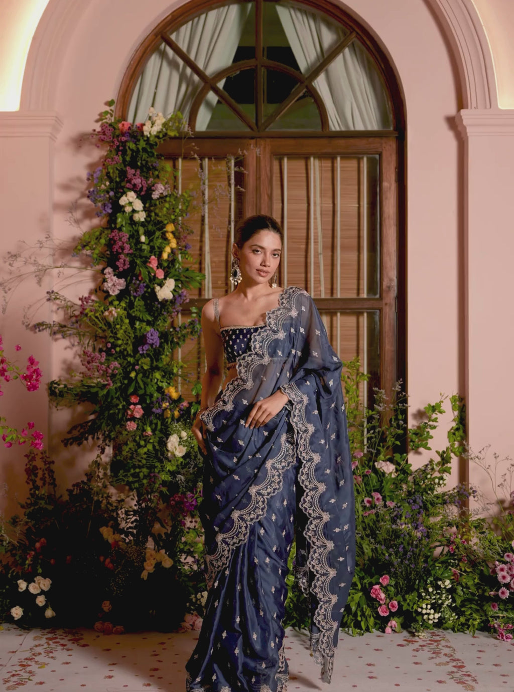 A timeless festive essential crafted in sheer Organza with a soft, fluid drape. This exquisite Navy saree is detailed with fine embroidery that adds texture while keeping the look clean and contemporary. Finished with a Pima Satin blouse that offers structure and comfort.