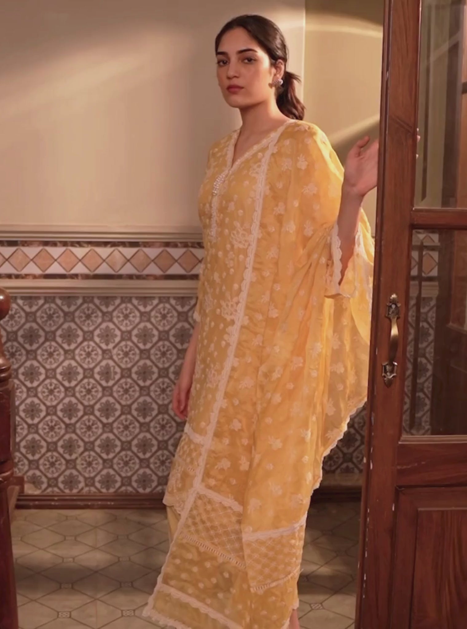 Mulmul Organza Aylin Yellow Kurta With Mulmul Cotton Aylin Yellow Dhoti Pant
